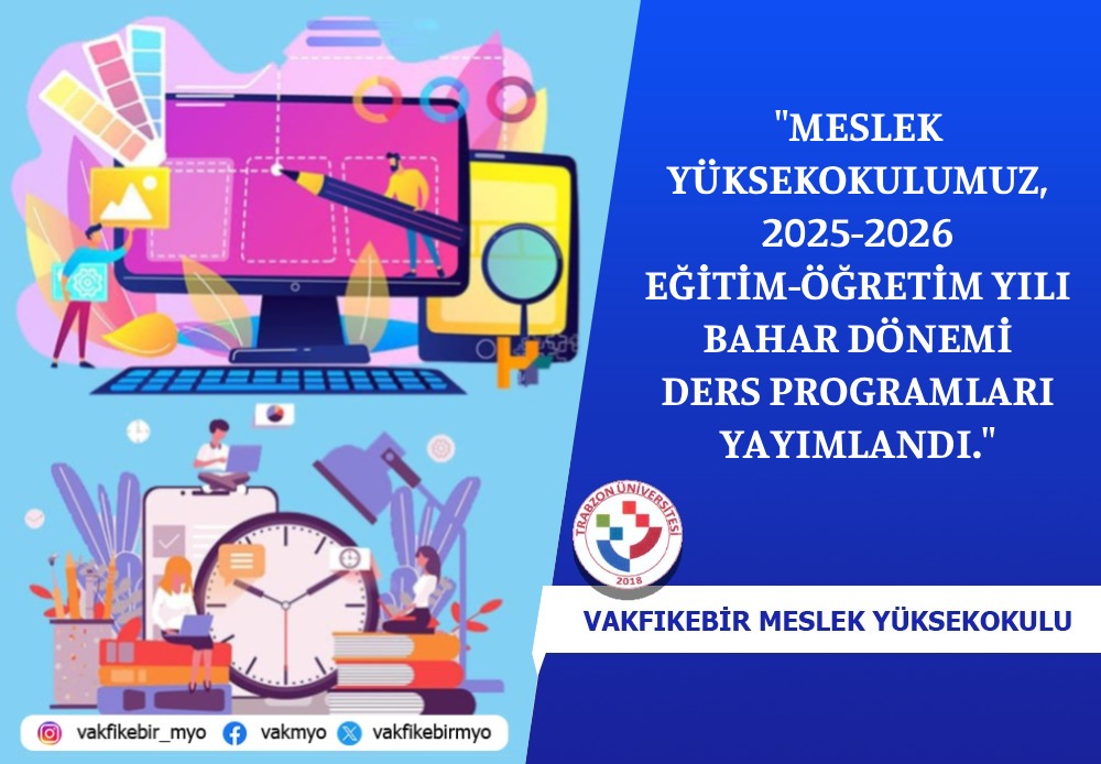 Meslek Yüksekokulumuz 2025-2026 Eğitim-Öğretim Yılı Bahar Yarıyılı Ders Programı Yayımlanmıştır.