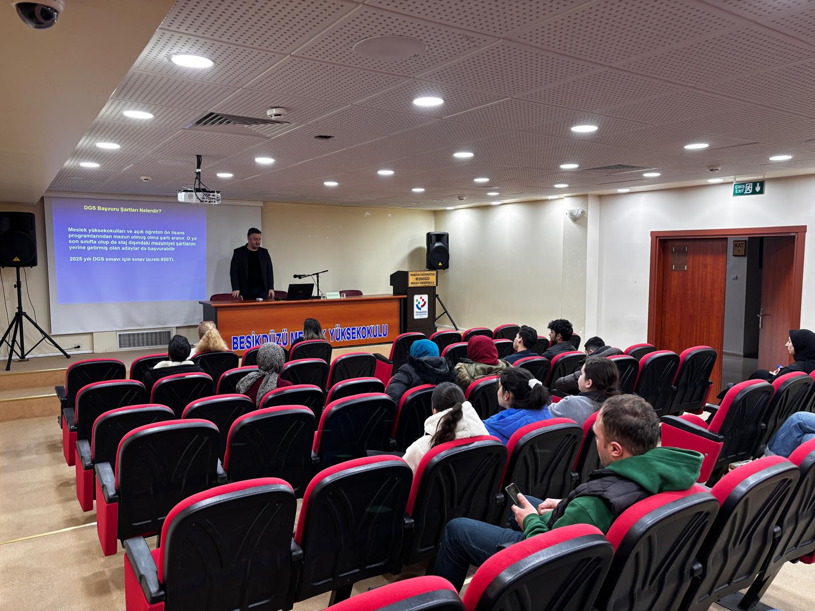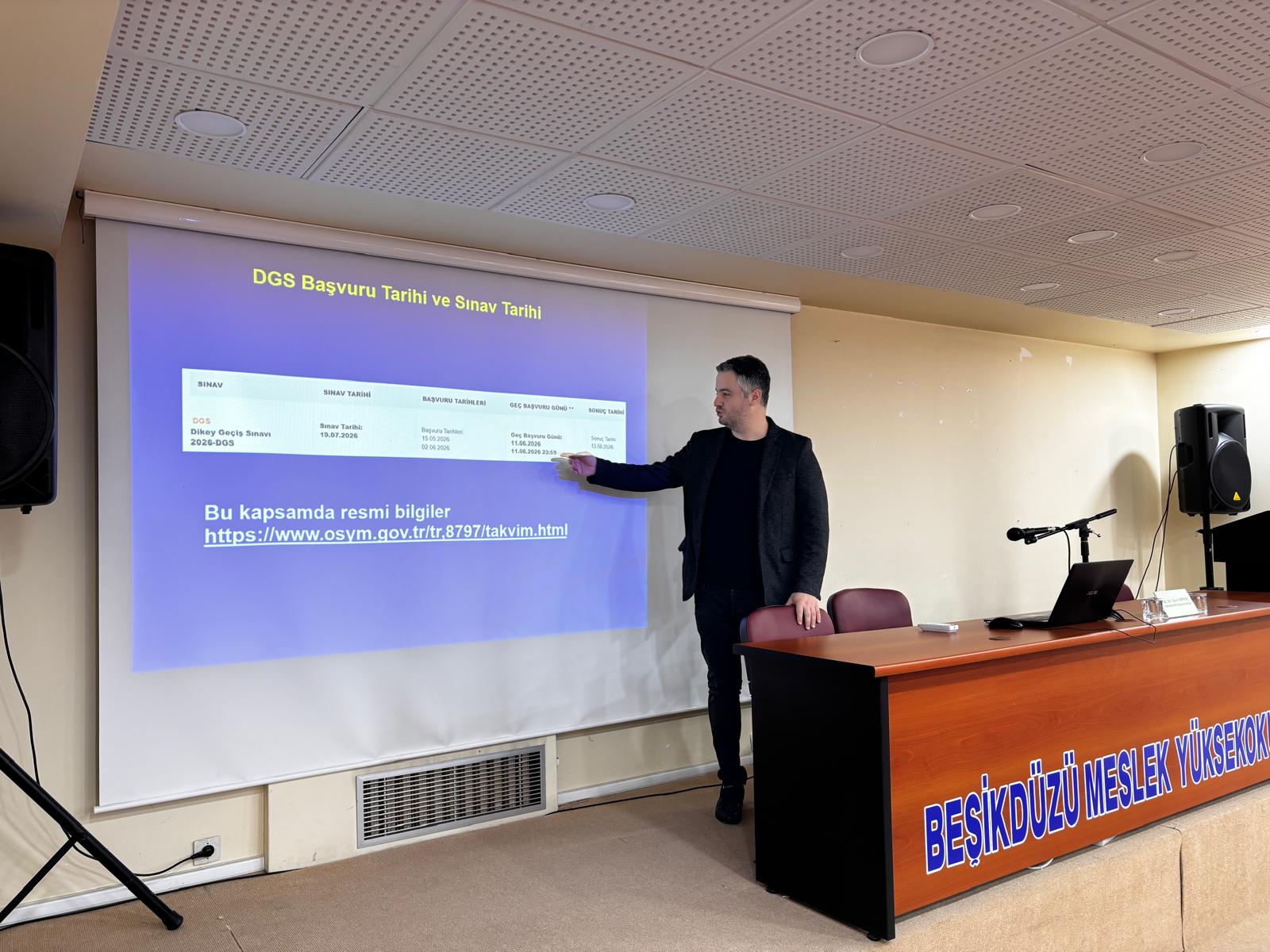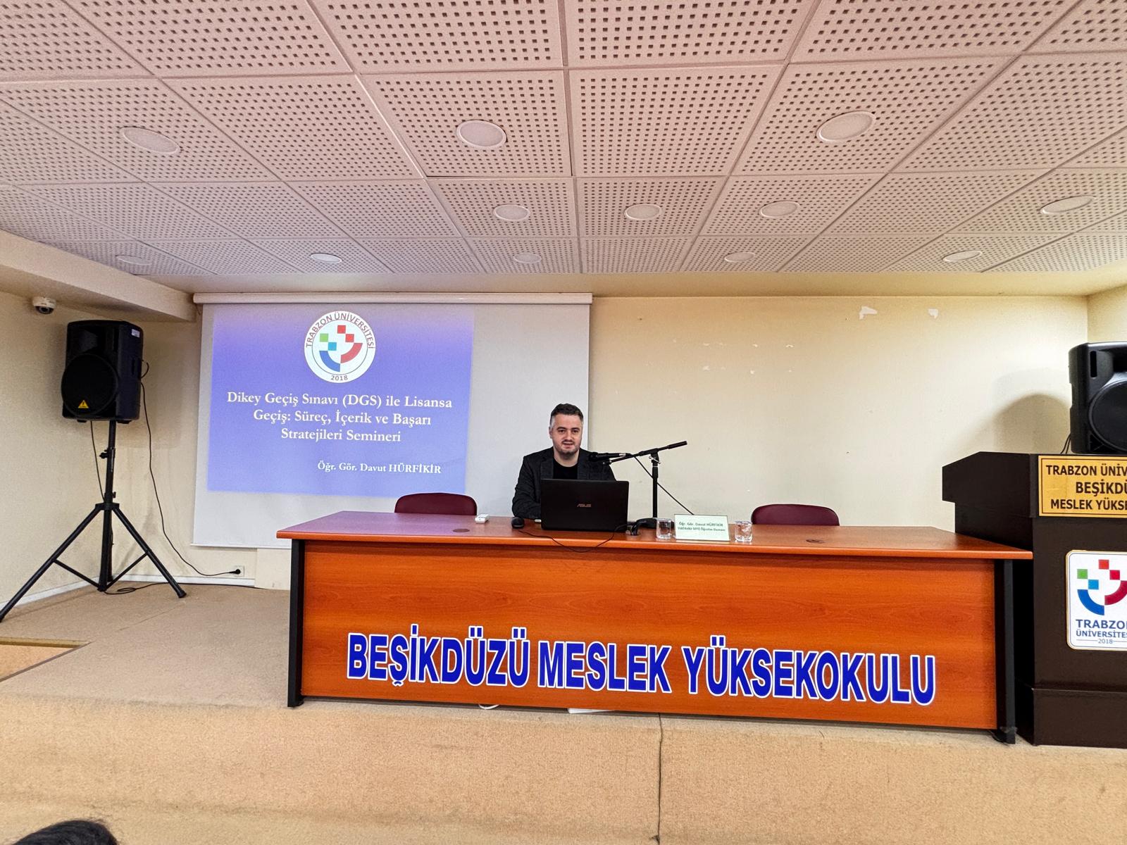 Meslek Yüksekokulumuz Öğretim Elemanlarından Öğr. Gör. Davut Hürfikir tarafından 24.03.2026 Salı günü saat 11.00'de Üniversitemiz Beşikdüzü Meslek Yüksekokulu Büro Hizmetleri ve Sekreterlik Bölümü Öğrencilerine "Dikey Geçiş Sınavı (DGS) ile Lisansa Geçiş: Süreç, İçerik ve Başarı Stratejileri" konulu kapsamlı bilgilendirme semineri düzenlendi.