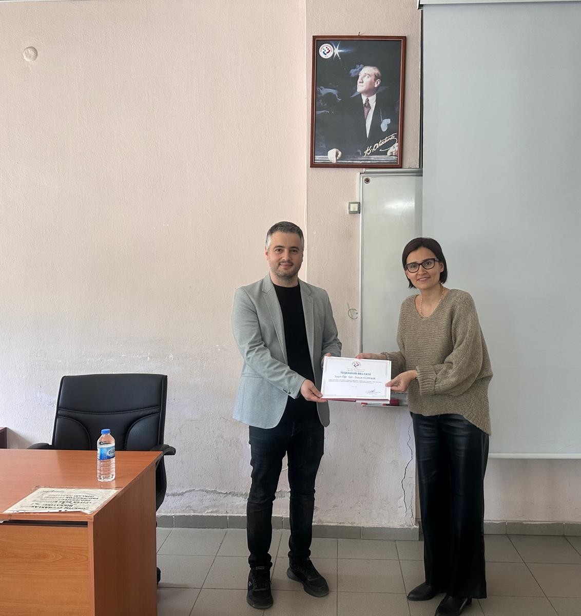 Seminer sonunda, Turizm ve Otelcilik Meslek Yüksekokulu Müdür Yardımcısı Doç. Dr. Esra Bulut tarafından, katkılarından dolayı Öğr. Gör. Davut Hürfikir’e Teşekkür Belgesi takdim edildi.