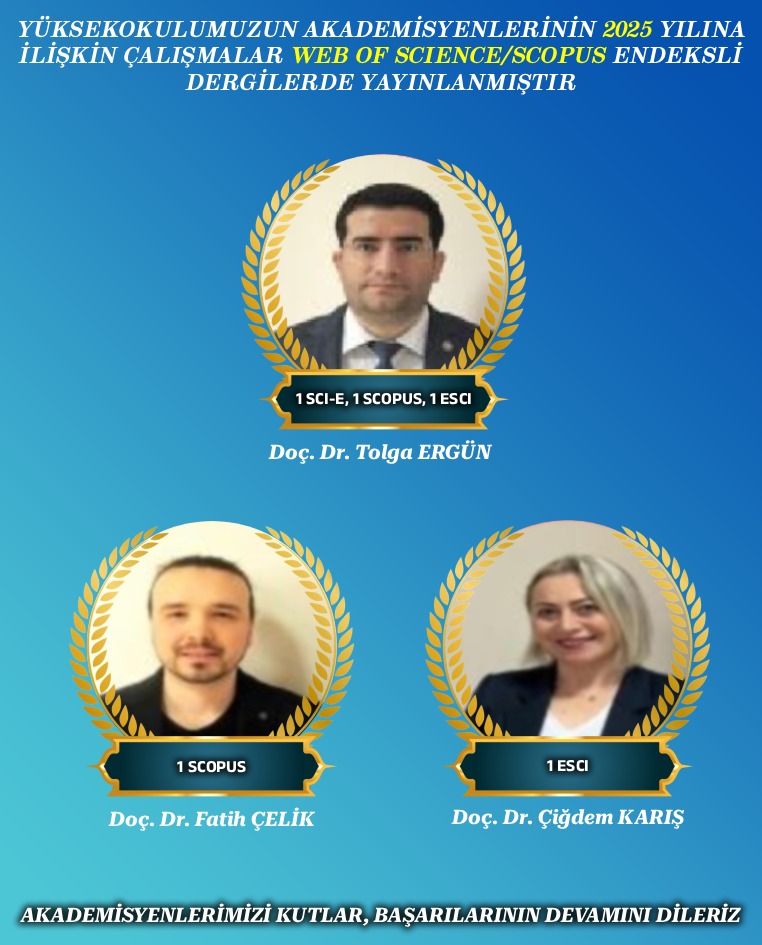 Meslek Yüksekokulumuz Akademisyenlerinin 2025 yılına ilişkin Uluslararası Endeks kapsamında yer alan Web of Science/Scopus dergilerindeki çalışmaları yayınlanmıştır.