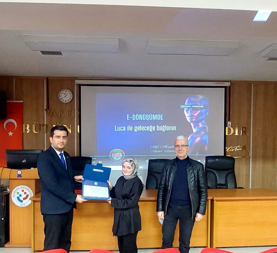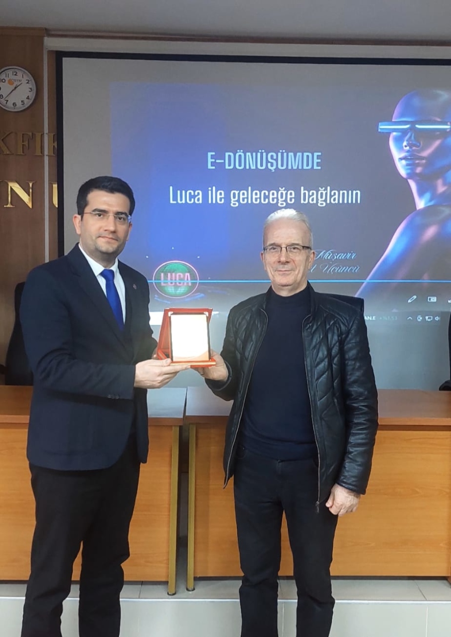 Sertifika takdim programı sonunda Meslek Yüksekokul Müdürümüz Doç. Dr. Tolga Ergün, Luca Karadeniz Bölge Sorumlusu Mali Müşavir Ahmet Üçüncü'ye katkılarından dolayı şükranlarını dile getirerek, Plaket takdim etti.