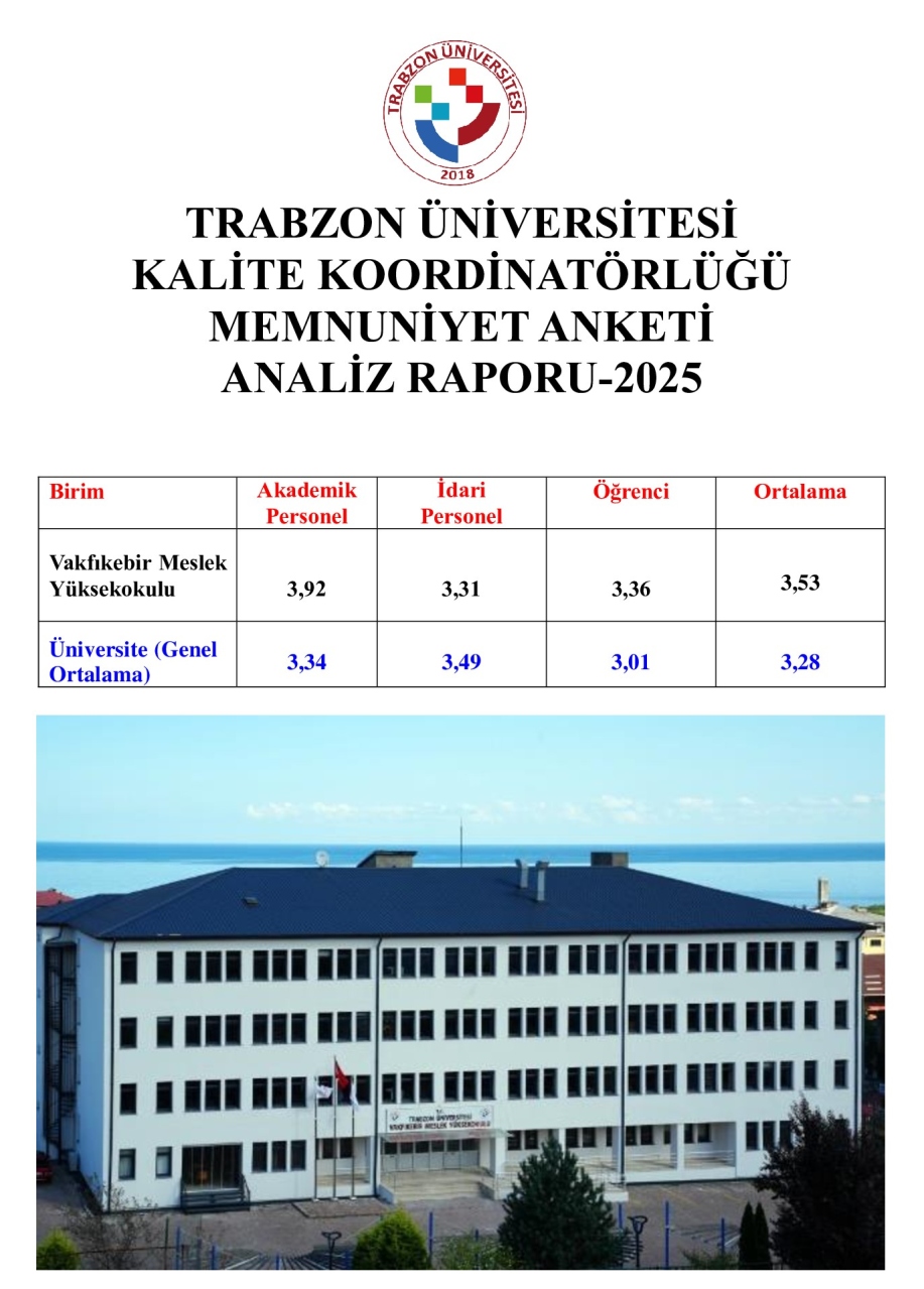 Üniversitemiz kalite koordinatörlüğü tarafından yapılan 2025 yılına ait memnuniyet anketi sonuçları doğrultusunda, Vakfıkebir Meslek Yüksekokulu’nun genel memnuniyet ortalaması 3,53 olarak hesaplanmış olup, ilgili değer üniversite genel ortalaması olan 3,28’in üzerinde gerçekleşmiştir. Bu sonuç, yüksekokulumuzun akademik birimler arasında ilk sıralarda yer aldığını göstermektedir. Elde edilen bulgular çerçevesinde, yüksekokulumuzda akademik- idari süreçlere yönelik memnuniyet düzeyinin yüksek olduğu, akademik personel memnuniyetinin ise yüksek ve istikrarlı bir seviyede seyrettiği görülmektedir.