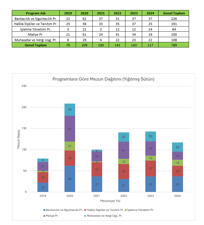 - Program bazlı dağılım yığılmış sütun grafiğinde, yıllık toplam mezun eğilimi ise çizgi grafikte net şekilde karşılaştırılabilir.