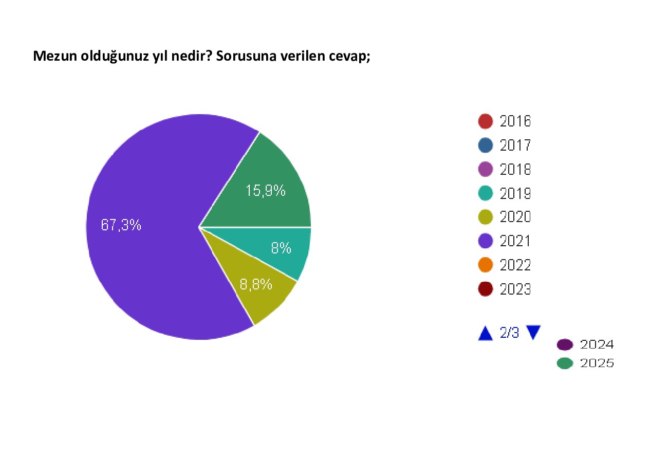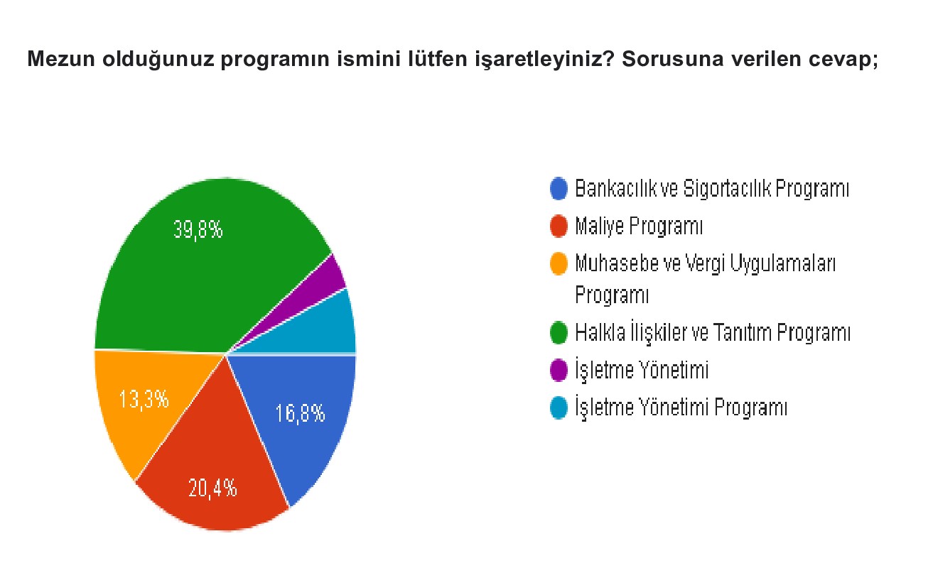 Hazırlanan çalışma Meslek Yüksekokulumuz kapsamında yapılmış olup "Mezun Anketi İçin Tıklayınız" adresine başvuru yapan mezunlarımızın verilerinden elde edilmiştir. Daha sağlıklı sonuçların elde edilebilmesi için tüm mezunlarımızı anketi doldurmaya davet ediyoruz.